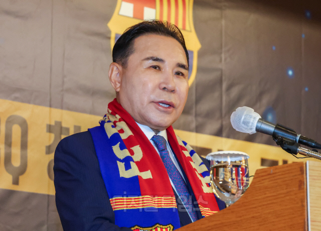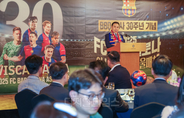 윤홍근 제너시스BBQ 그룹 회장이 10일 서울 중구 롯데호텔에서 BBQ 창사 30주년 기념 스페인 프로축구 FC바르셀로나 초청 경기 계획을 발표하고 있다.