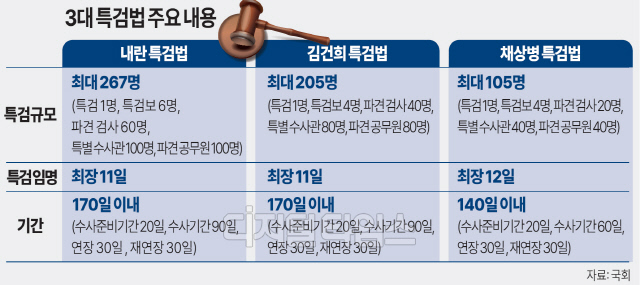 '김건희 특검법'은 김건희씨의 도이치모터스 주가조작 의혹과 명품 가방 수수 의혹, '건진법사' 관련 의혹, 정치 브로커 명태균 씨가 연루된 공천 개입·불법 여론조사 의혹 등 총 16개가 수사 대상이다. '채상병 특검법'은 2023년 7월 실종자 수색 작전 중에 발생한 해병대 채상병 사망사건의 사고 경위와 정부 고위 관계자의 수사 방해 의혹 등을 규명하는 내용을 담았다.