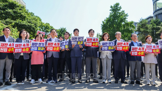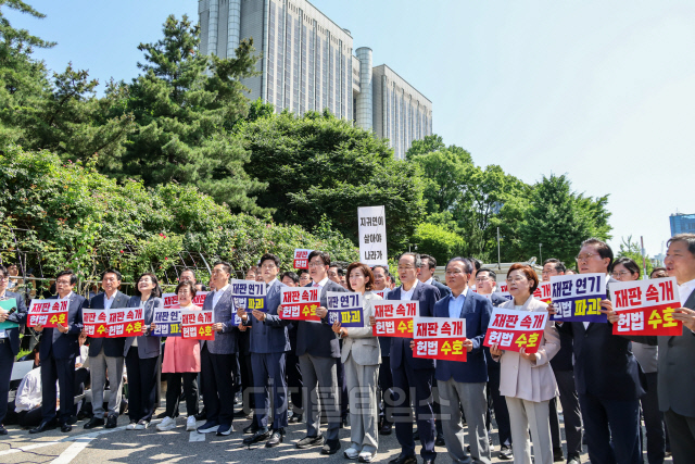 김용태 국민의힘 비상대책위원장과 권성동 원내대표가 11일 서울 서초구 서울중앙지방법원 앞에서 열린 '헌법 파괴 저지를 위한 현장 의원총회'에서 정부·여당을 향한 규탄 구호를 외치고 있다.