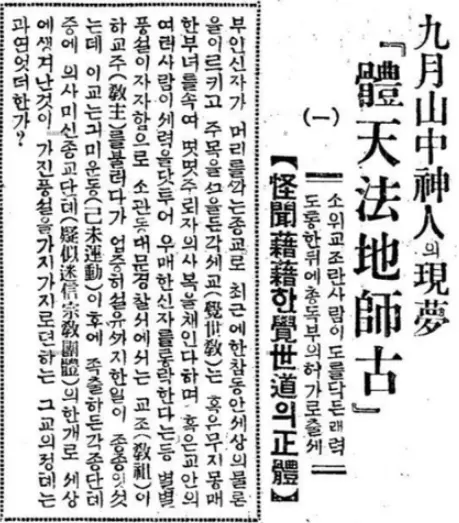 맹자(孟子) 진심장구하(盡心章句下)편에서 유래한 사이비(似而非)라는 말은 ‘비슷하지만 아니다’라는 뜻이다. 겉으로는 비슷하나 속은 완전히 다른 것, 즉 진짜 같은 가짜를 가리키는 말이다. 세상이 어려울 때 많이 나타나는 것이 바로 사이비 종교다. 100년 전에도 사이비 종교가 판을 쳤었다. 그중에서도 이목을 끄는 한 종교에 대한 연재가 1925년 9월 동아일보 지면에 등장한다.