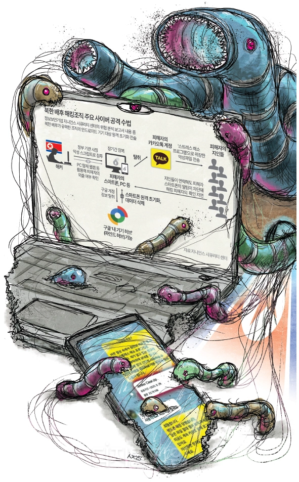 보고서에 따르면 지난 9월 5일 해커가 국내 한 심리 상담사의 스마트폰을 초기화하고 탈취한 카톡 계정을 통해 ‘스트레스 해소 프로그램’으로 위장한 악성 파일을 지인들에게 다수 전송했다. 같은 달 15일 북한 한 인권 운동가의 안드로이드 스마트폰도 초기화되는 사고가 발생했다. 이 운동가의 카톡 계정도 털리며 악성 파일이 지인 36명에게 동시다발적으로 유포되는 사건이 발생했다.