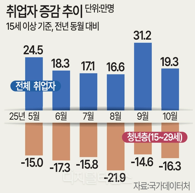국가데이터처가 12일 발표한 ‘10월 고용동향’에 따르면 지난달 취업자 수는 2904만명으로 지난해 같은 기간보다 19만3000명(0.7%) 증가했다. 월간 취업자 증감수는 올해 5월(24만5000명), 9월(31만2000명)을 빼면 매달 10만명대 증가 폭을 기록했다.