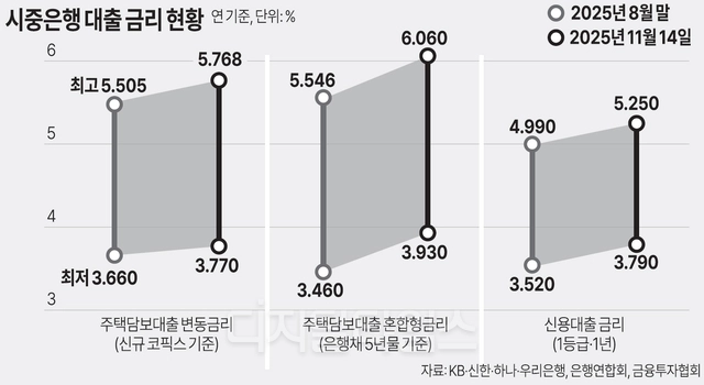 4대 은행에서 6%대 혼합형 금리는 지난 2023년 12월 이후 약 2년 만에 처음이다. 두 달 보름 전인 8월 말(연 3.460∼5.546%)과 비교해 상단이 0.514%포인트(p), 하단이 0.470%p 높아졌다. 이는 같은 기간 혼합형 금리의 주요 지표인 은행채 5년물 금리가 2.836%에서 3.399%로 0.563%p 뛰었기 때문이다.