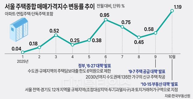 한국부동산원이 17일 발표한 10월 전국 주택가격 동향조사에 따르면 지난달 서울 주택종합(아파트·연립·단독) 매매가격지수는 전월 대비 1.19% 상승했다.