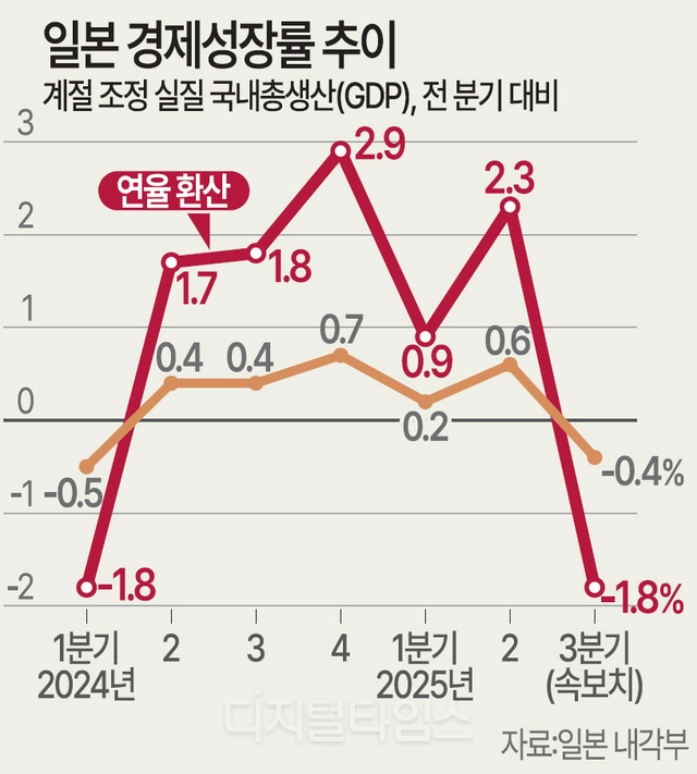 경제성장률도 6분기만에 후퇴했다. 일본 내각부가 17일 발표한 올해 3분기 실질 국내총생산(GDP·속보치)은 전 분기보다 0.4% 감소했다. 연율 환산 기준 성장률은 -1.8%다. 이로써 작년 2분기 이후 5분기 연속 이어진 플러스 행진이 멈췄다. 미국 관세 인상으로 자동차와 부품 부문 수출이 급감한 점이 주요 원인으로 꼽았다.