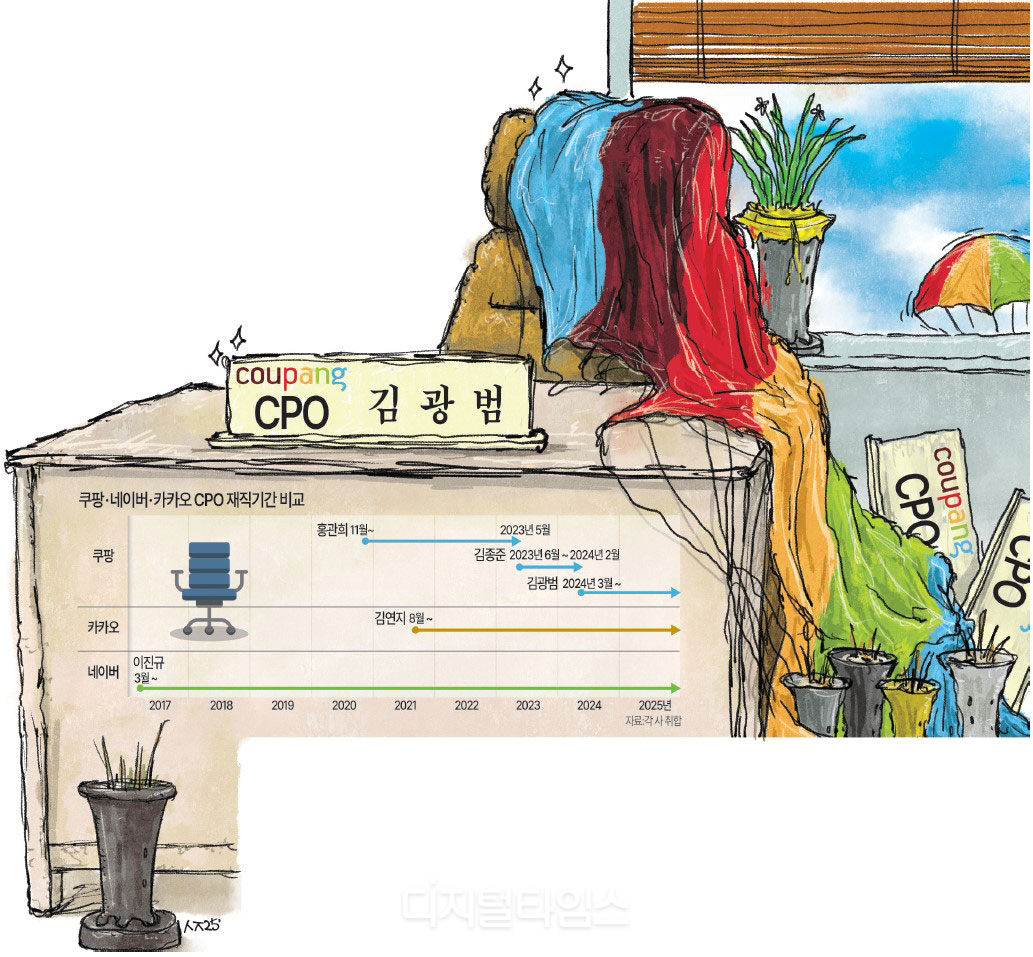 쿠팡의 CPO 재직기간은 이른바 ‘네카쿠’로 묶이는 또다른 온라인 공룡인 네이버, 카카오와 극명하게 대조된다.