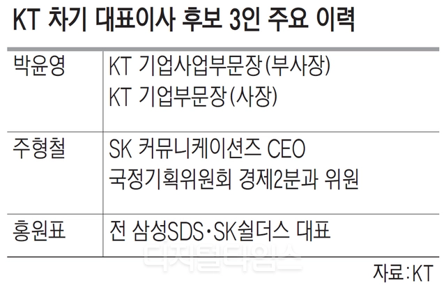 KT 대표 후보 선정은 사외이사 8인으로 구성된 이사후보추천위원회가 담당하고 있다. 추천위는 외부 전문기관 추천, 공개 모집, 사내 지원 등을 종합해 후보군을 구성했다. 이후 지난 9일 박윤영, 주형철, 홍원표 3인으로 후보군을 압축했다. 앞으로 심층 면접을 거쳐 연내 최종 후보 1인을 선정할 계획이다.