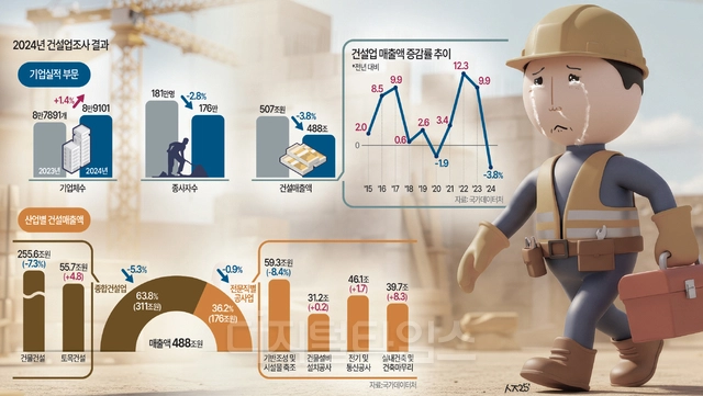16일 국가데이처가 발표한 ‘2024년 건설업 조사(기업실적 부문)’에 따르면 지난해 건설업 매출액은 487조7000억원으로, 전년보다 3.8%(19조원) 감소했다. 건설업 매출은 2023년 500조원 선을 돌파했으나 지난해 하락하면서 다시 400조원대로 밀려났다.