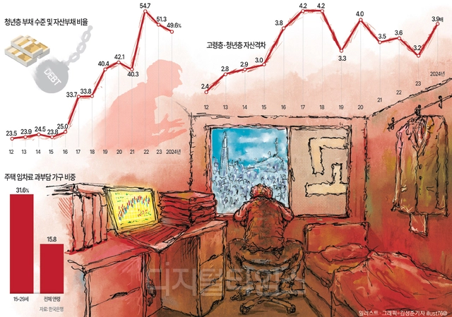 주거비 상승은 자산 형성과 미래 투자 여력까지 제약하는 구조로 이어지고 있다. 한은에 따르면 주거비가 1% 상승할 경우 총자산은 0.04% 감소하는 것으로 나타났다. 주거비 지출 비중이 1%포인트 늘어나면 교육비 비중은 0.18%포인트 줄어드는 것으로 추정됐다. 청년층의 부채 비중도 2012년 23.5%에서 2024년 49.6%로 크게 확대됐다.