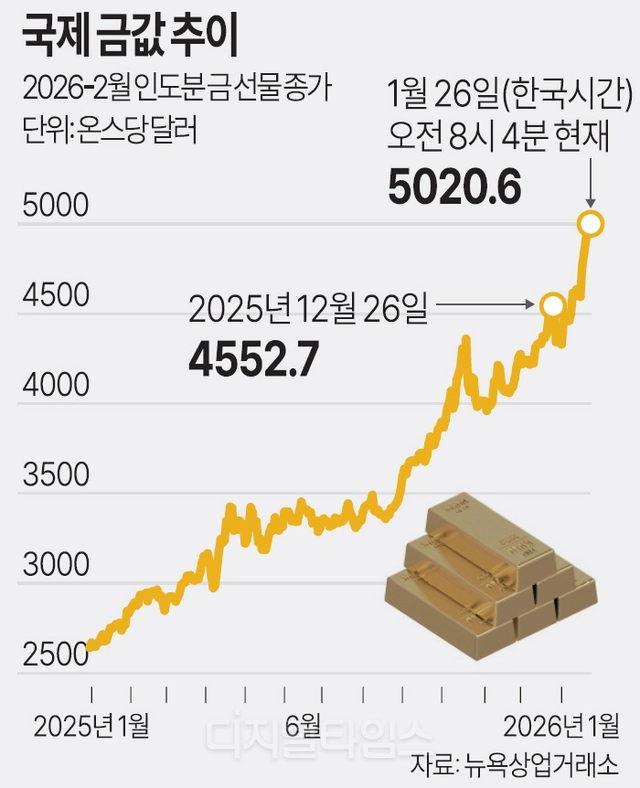 26일 인베스팅닷컴 등에 따르면 이날 국제 금 현물 가격은 전장 대비 1.03% 오른 온스당 5034.05 달러에 거래되고 있다. 금값이 사상 처음으로 온스당 5000달러를 돌파하며 역사적 고점을 새로 썼다.