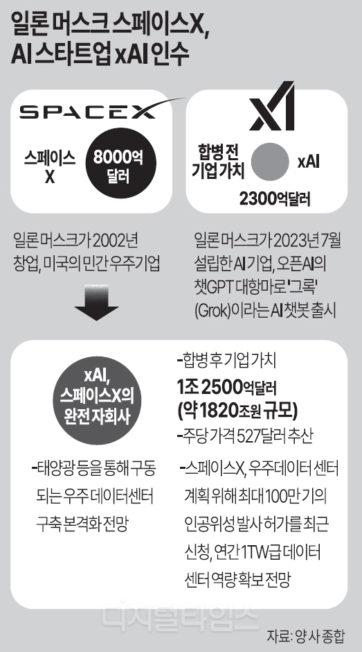 4일 정보기술(IT) 업계에 따르면 일론 머스크는 지난 2일(현지시간) 스페이스X가 AI 기업 xAI를 인수해 기업가치 약 1조2500억달러(약 1814조원) 규모 초대형 기술 기업으로 재편된다고 밝혔다. 로켓과 위성 통신 사업에 AI 기술을 결합해 미래 우주 인프라 시장을 선점하기 위한 전략이다.