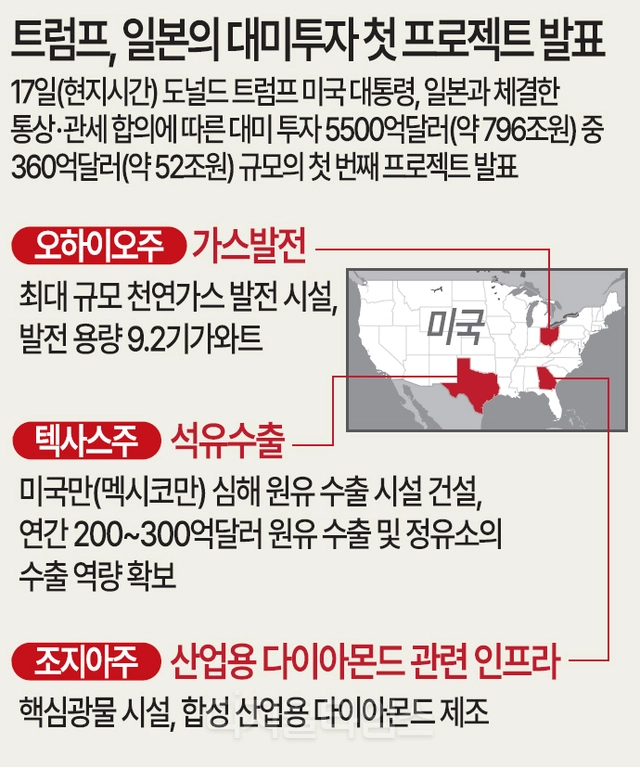 도널드 트럼프 미국 대통령이 17일(현지시간) 일본과 체결한 통상·관세 합의에 따라 일본이 미국에 투자하기로 한 투자금의 사용처를 처음으로 공개했다. 미국과 일본은 지난해 무역협상에서 미국이 일본에 상호관세를 15%로 낮추면서 일본은 미국에 5500억달러(약 796조원) 투자금을 지급하기로 합의한 바 있다.