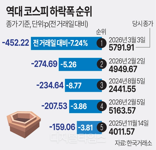 한국거래소에 따르면 이날 코스피 지수는 전장 대비 452.22포인트(-7.24%) 급락한 5791.91을 기록했다. 코스피지수가 종가 기준 5700선대로 내려앉은 건 지난달 19일 이후 처음이며 역대 최대 하락폭이다.