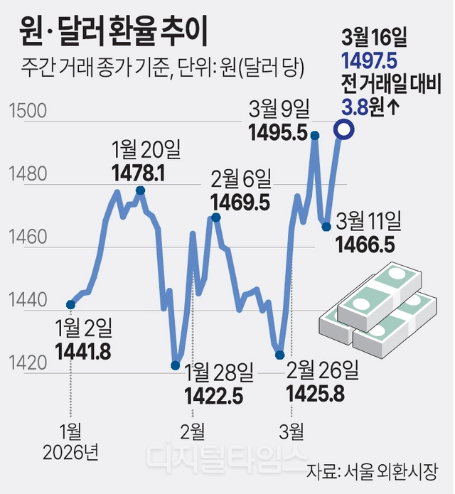 외환시장에서는 원·달러 환율이 당분간 1500원 안팎에서 움직일 가능성이 크다는 전망이 나온다. 중동 전쟁 장기화와 고유가 흐름이 이어질 경우 원화 약세 압력이 지속될 수 있기 때문이다.